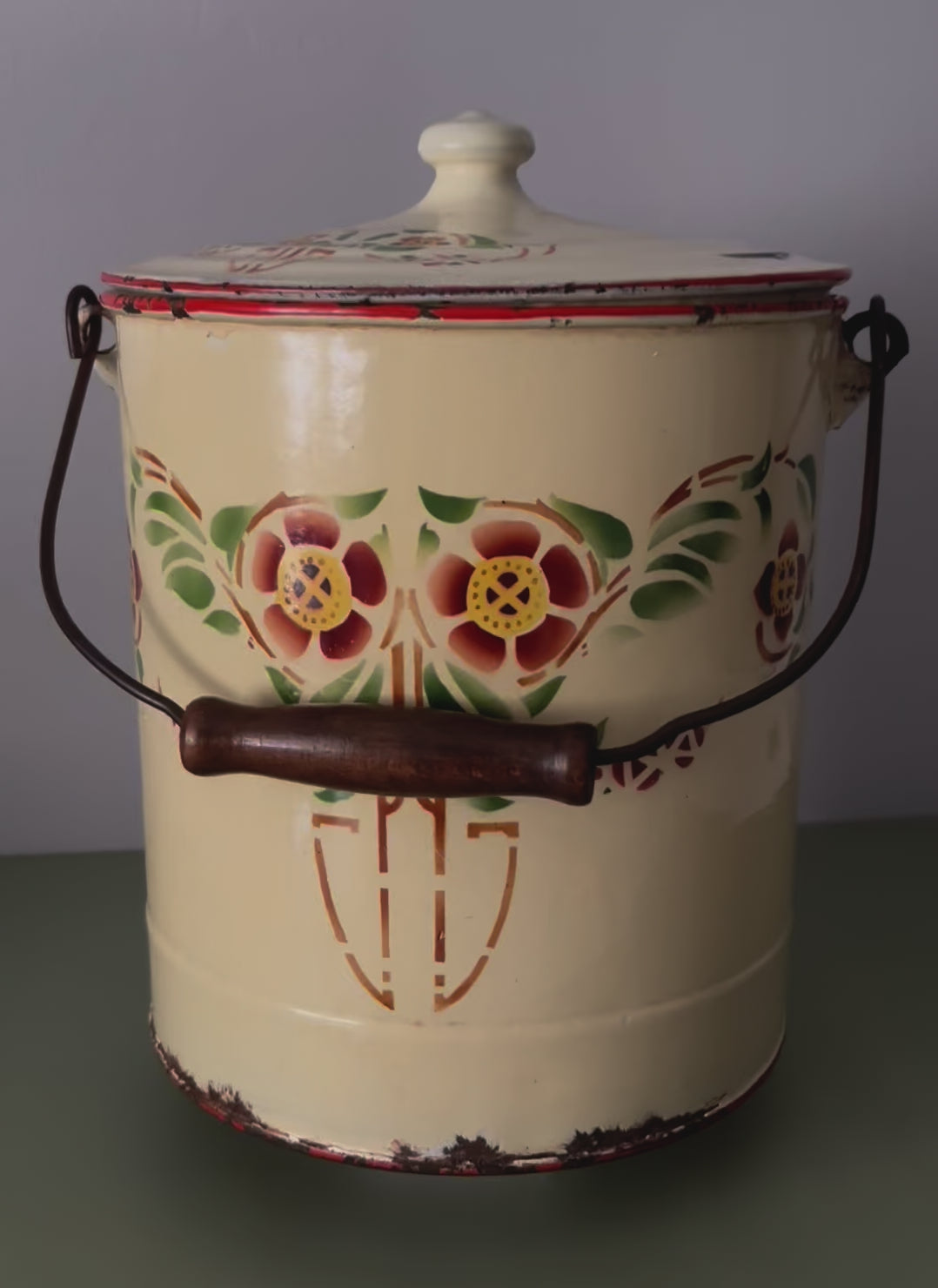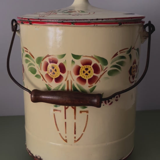 Très joli ancien pot de chambre en tôle émaillée art déco avec des traces d'usure (voir photos et vidéo)