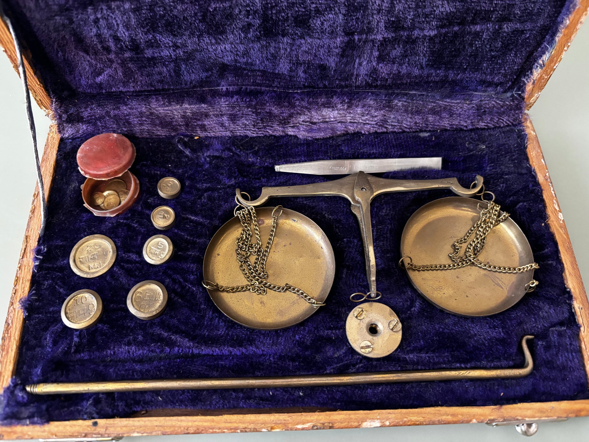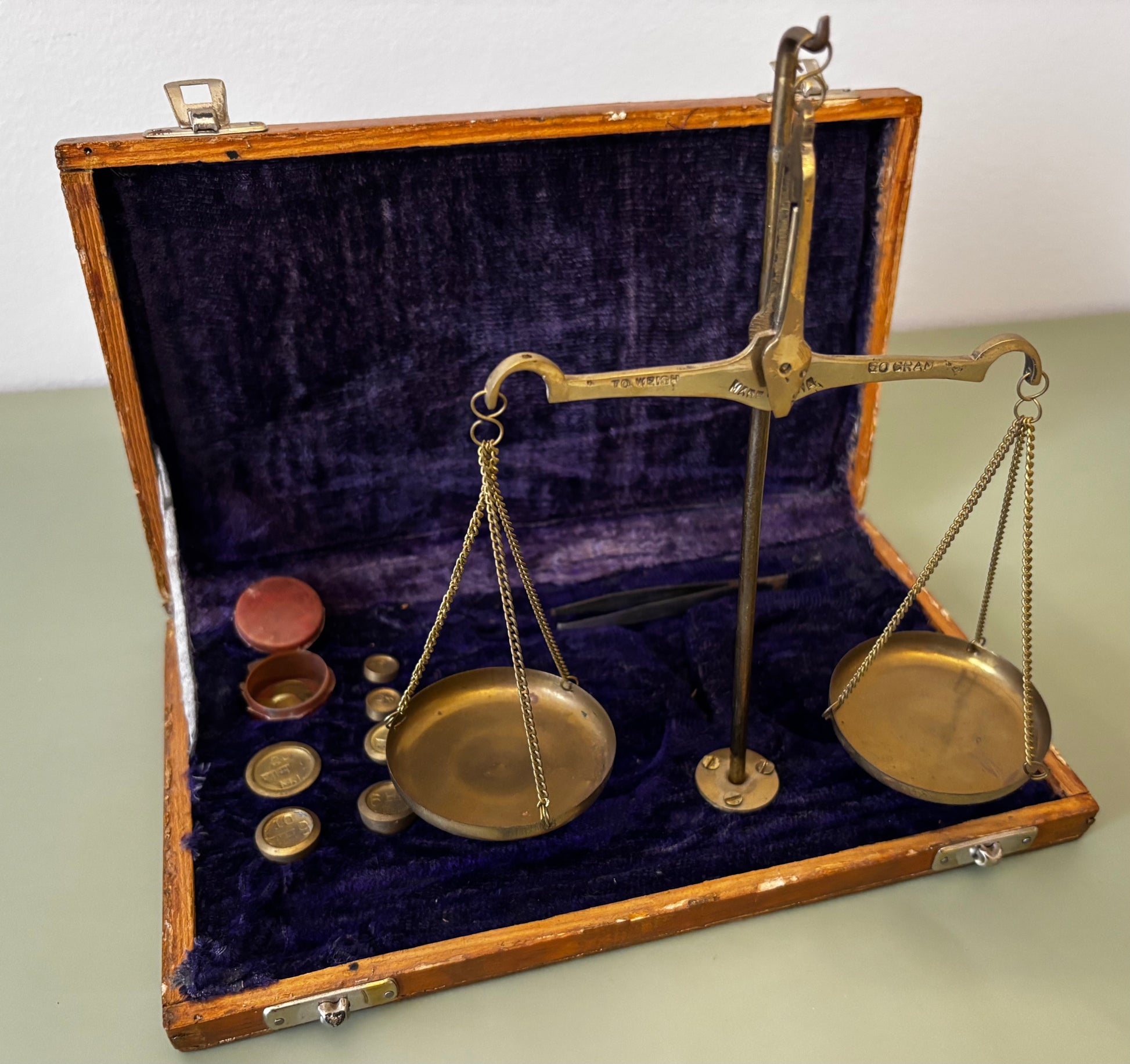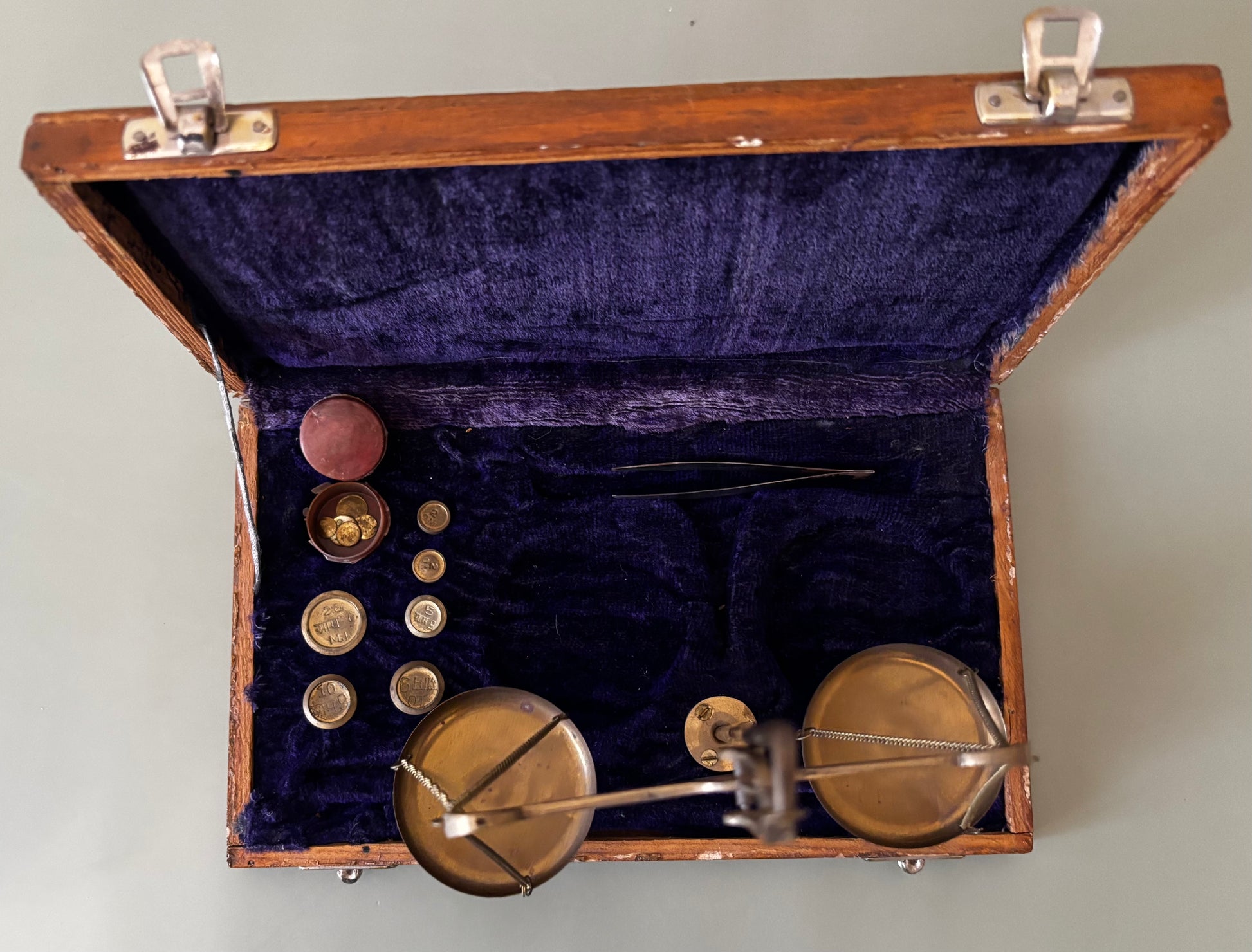 Petite Balance Trébuchet dans son coffret en bois, vendue avec ses poids allant de 20mlg à 20g.