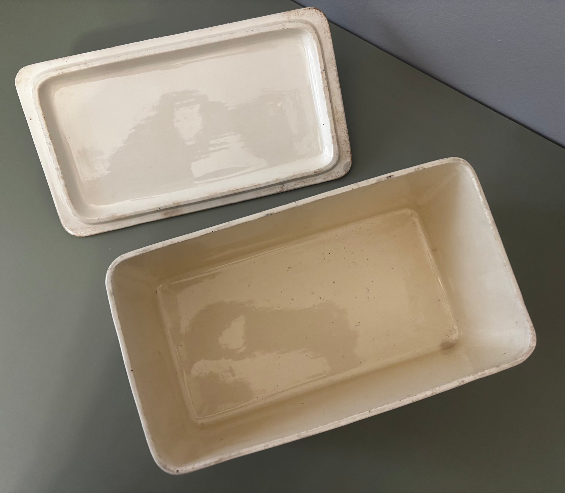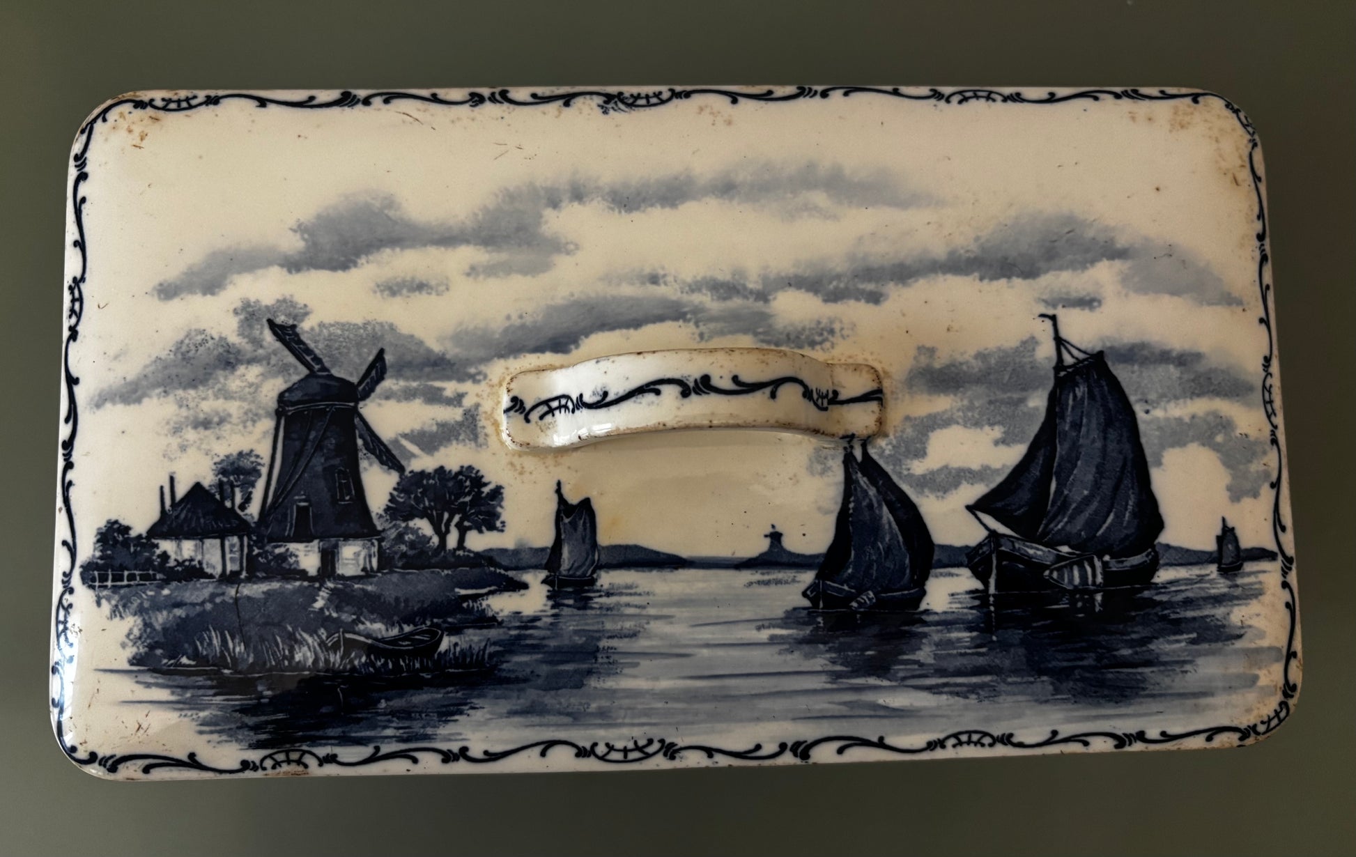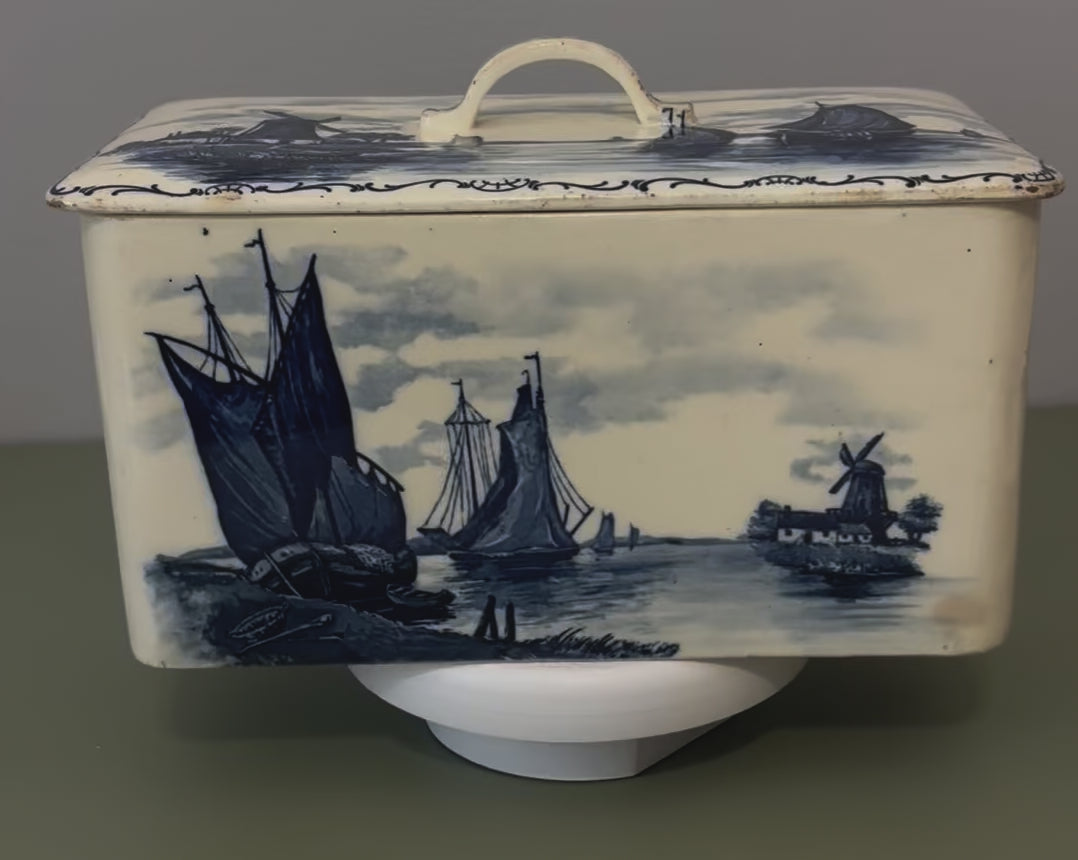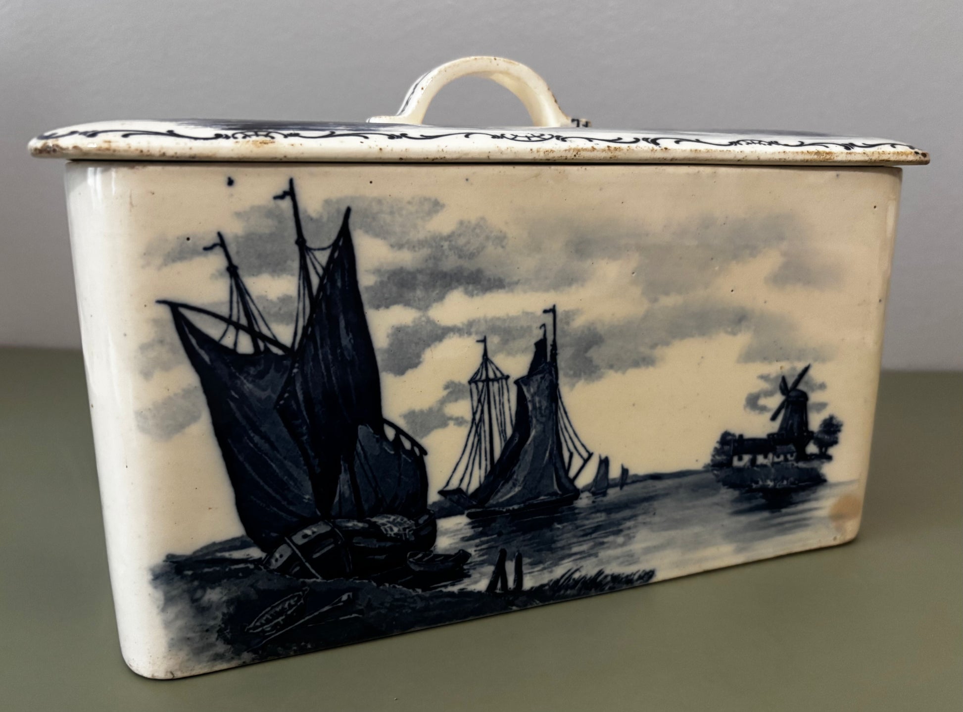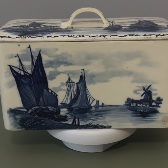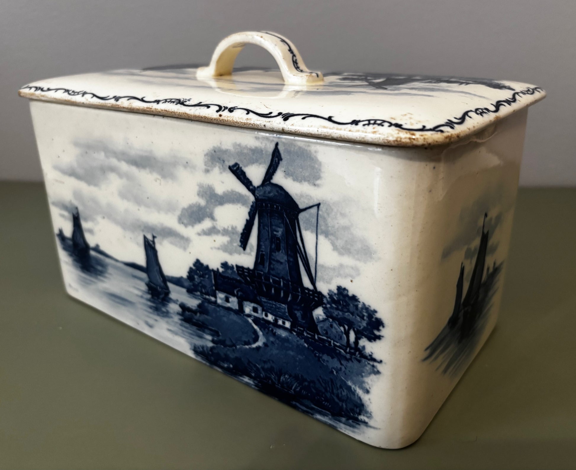 Très jolie boîte à biscuit en faïence de la marque DELFT avec des motifs de scènes hollandaises traditionnelles peints en bleu cobalt