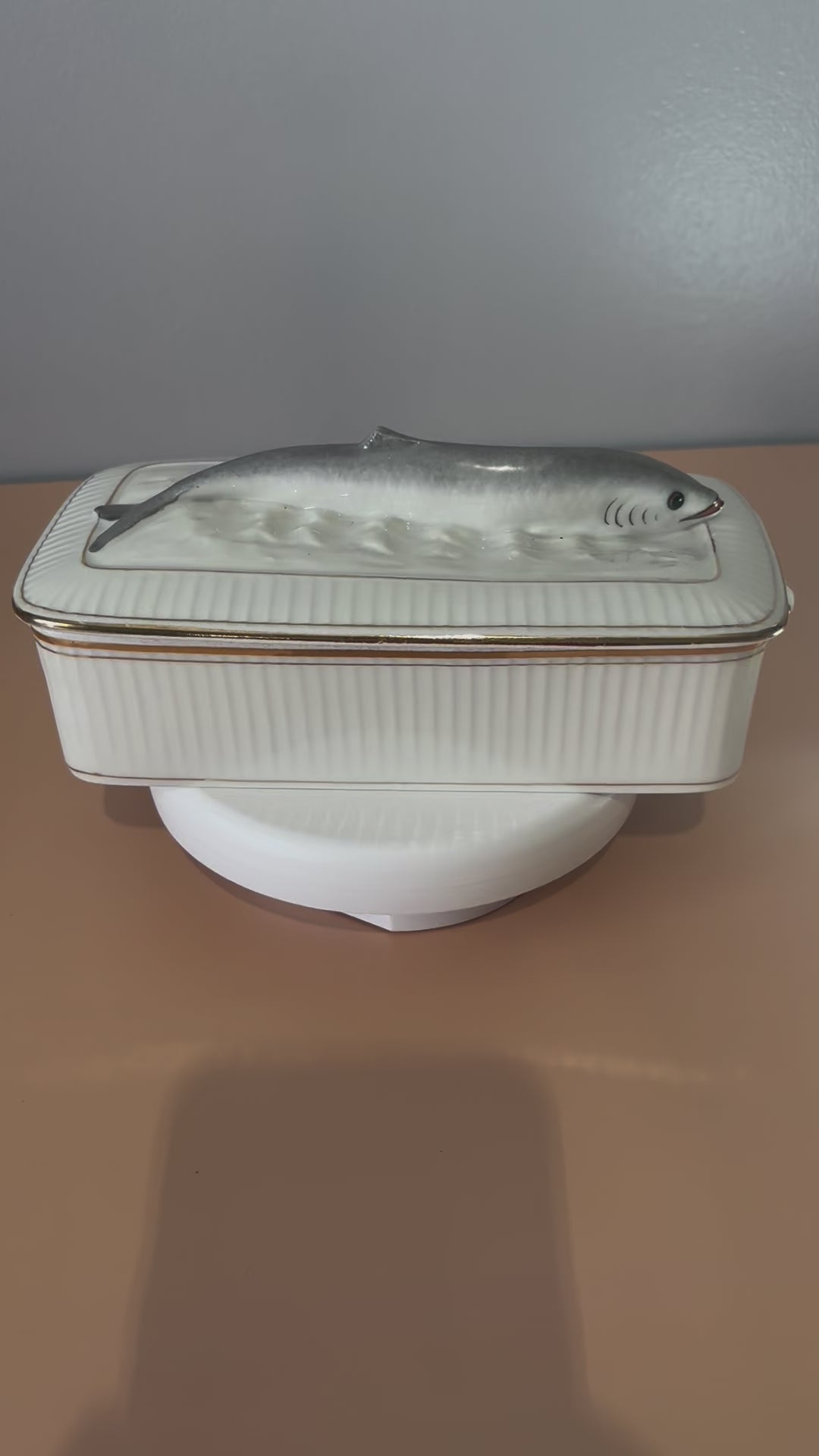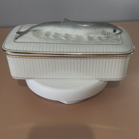 - Boîte à sardines en porcelaine blanche avec un liseré doré.