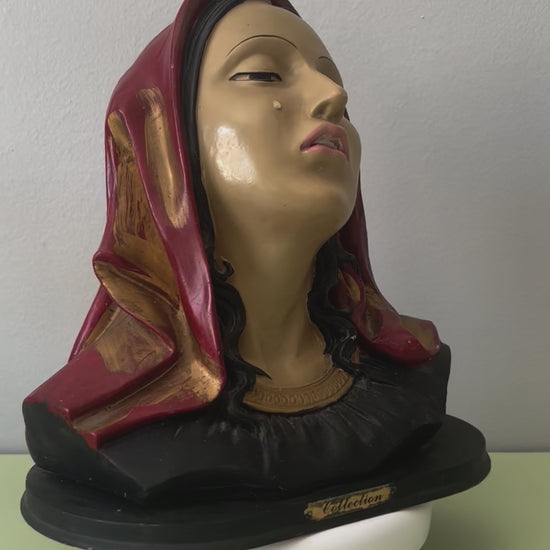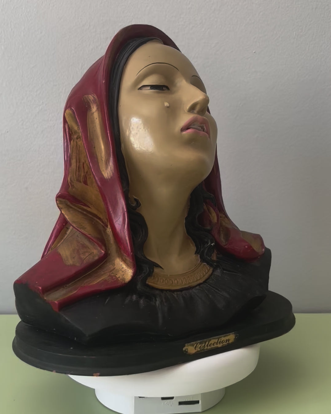 Buste "Collection" en plâtre posé sur une planche de bois, le tout peint, représentant une femme qui pleure