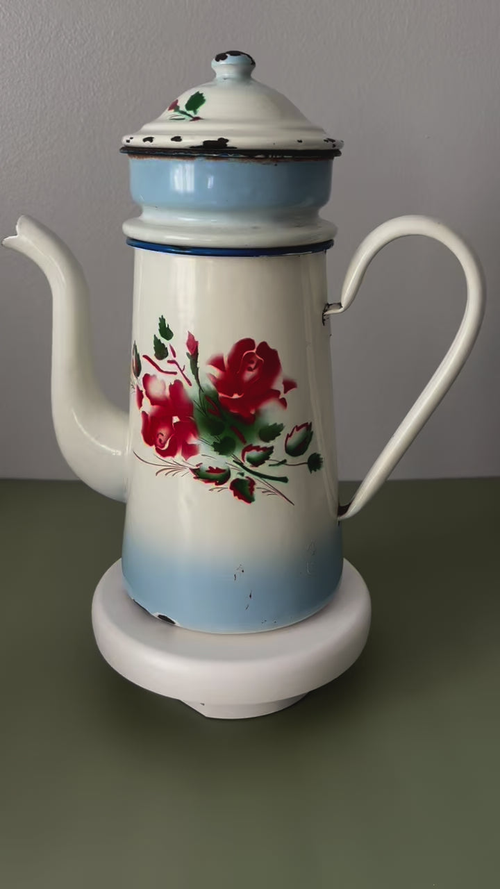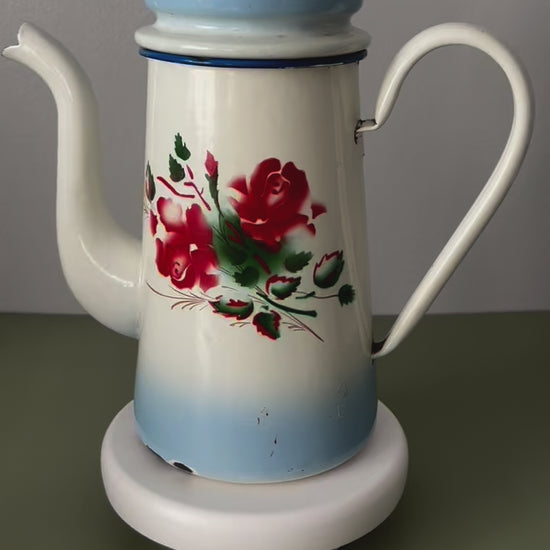 - Petite cafetière émaillée décorée de fleurs et d'un liseré bleu.
