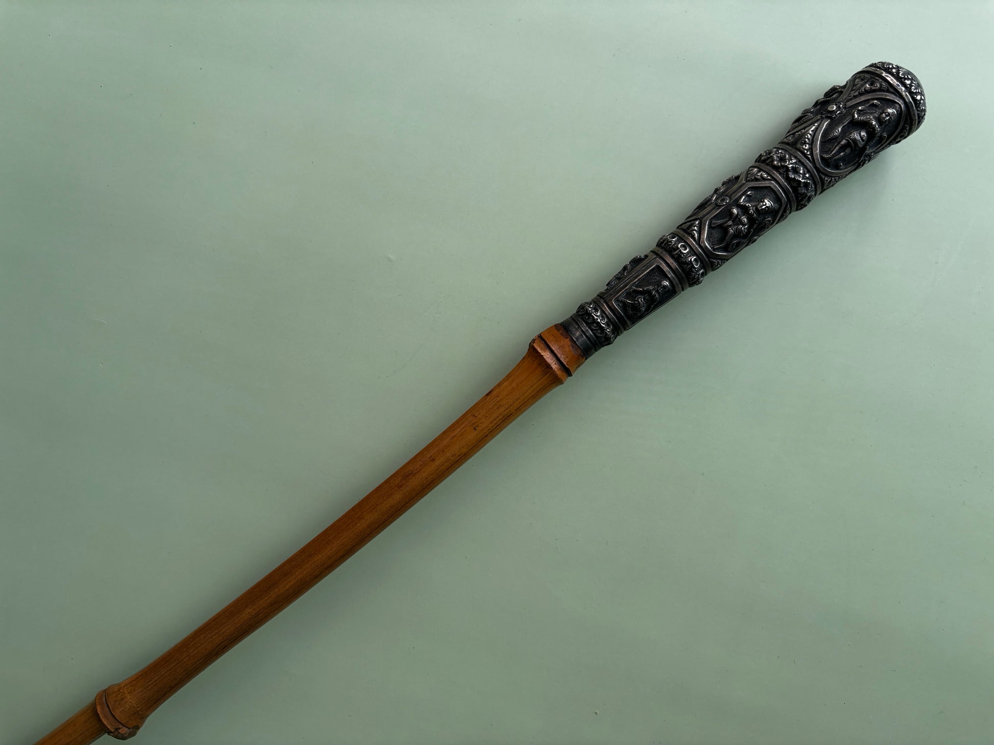 Canne en bambou et pommeau en argent sculpté de 3 médaillons sur 3 niveaux