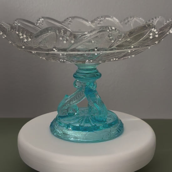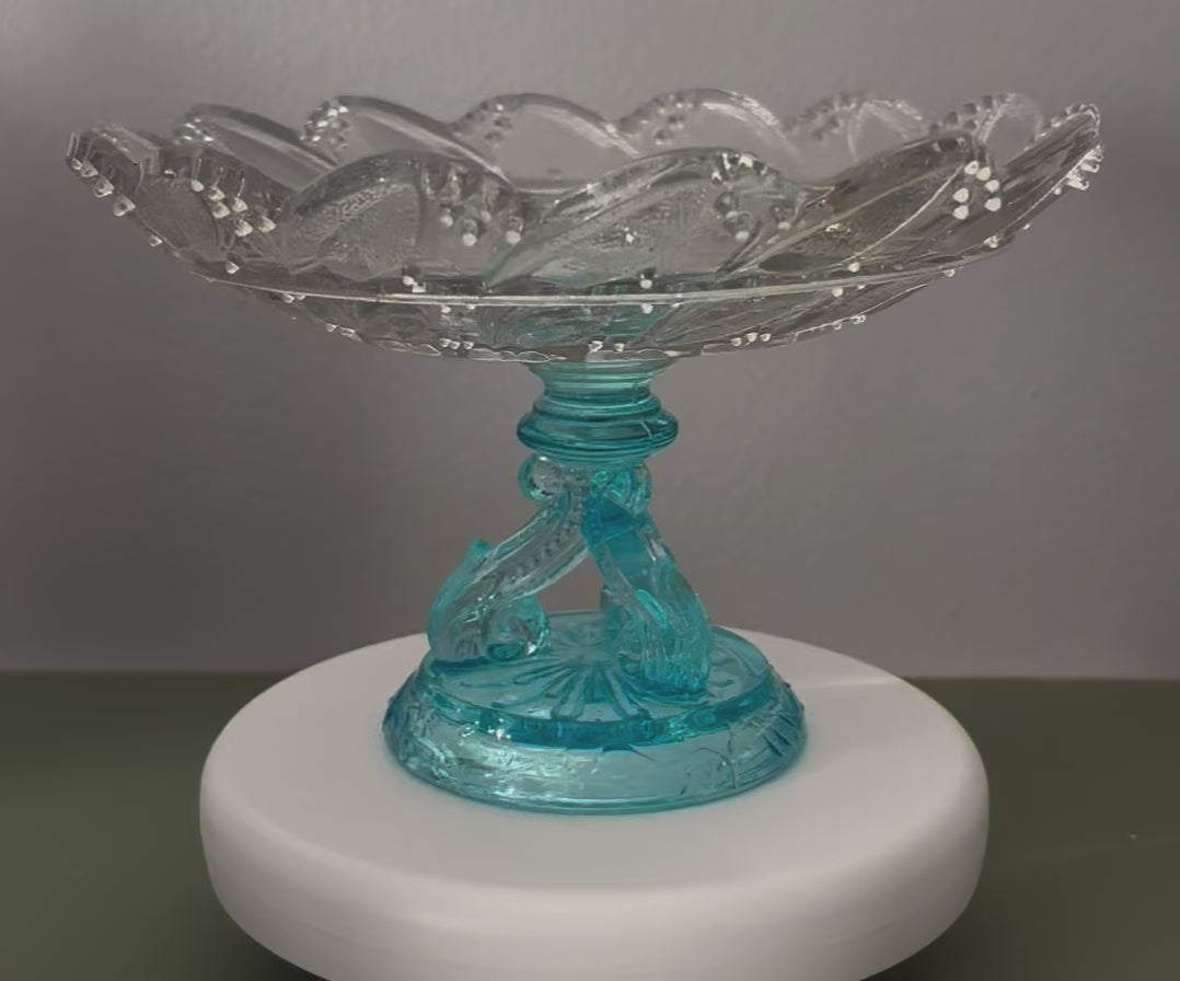 Jolie coupe en verre avec un décor floral : plateau transparent et pied bleu