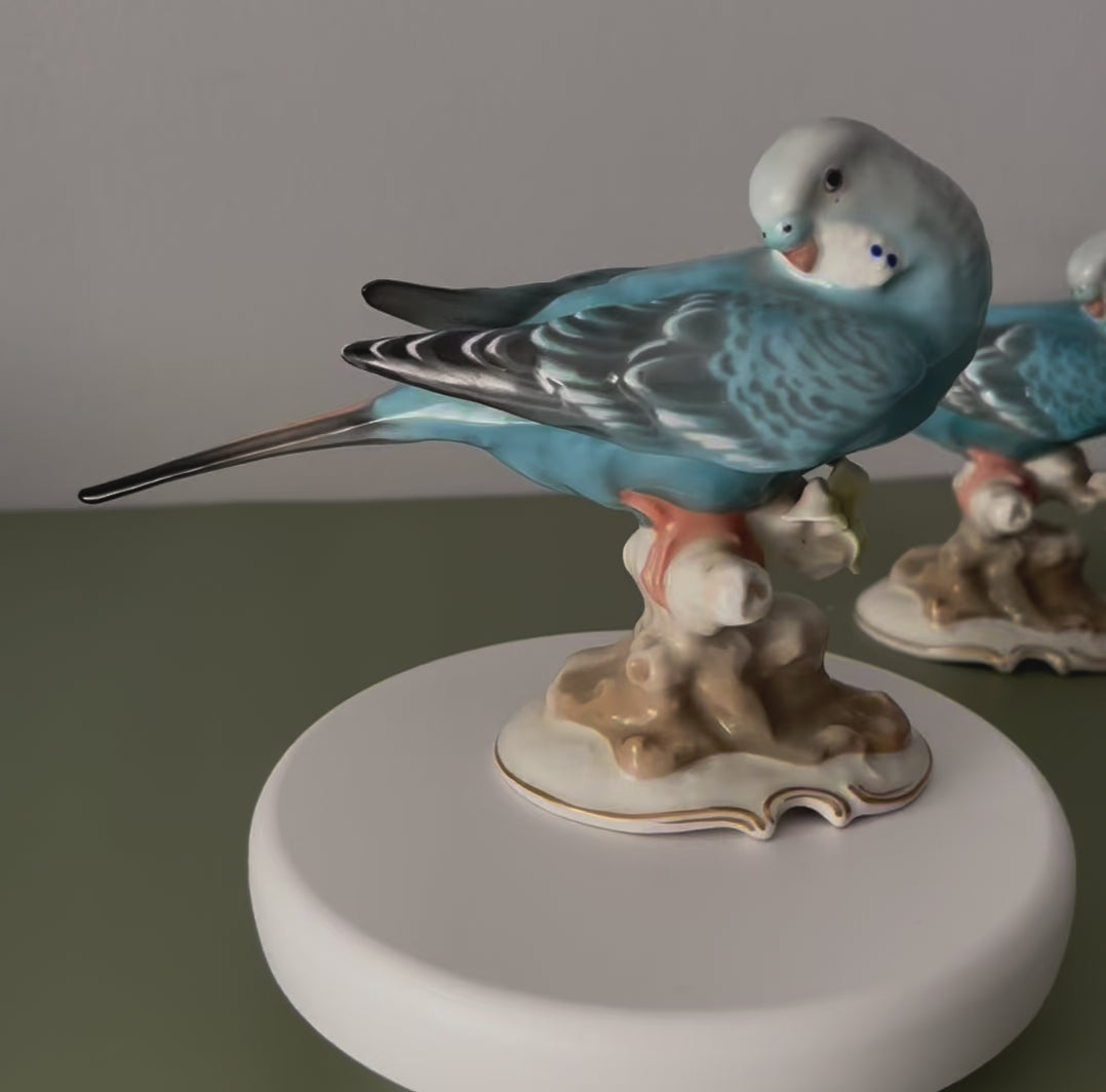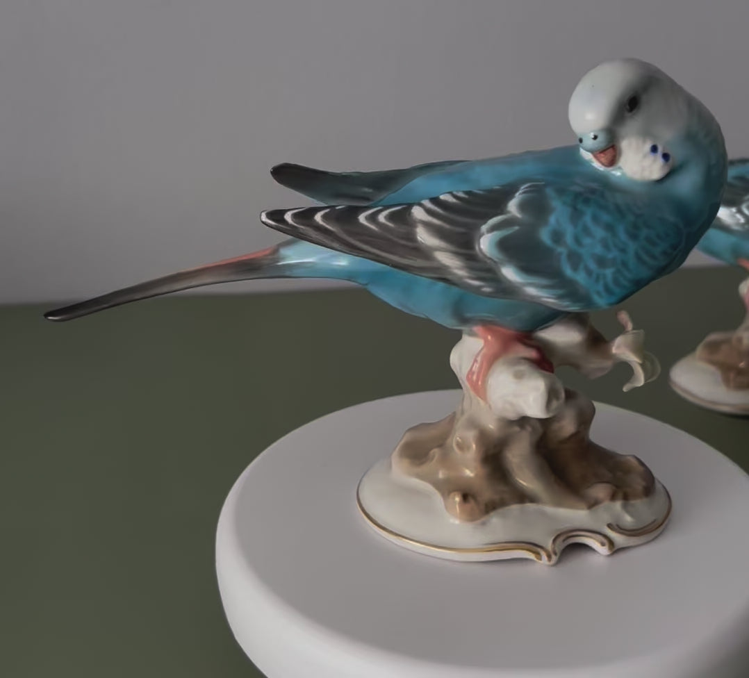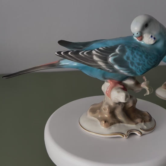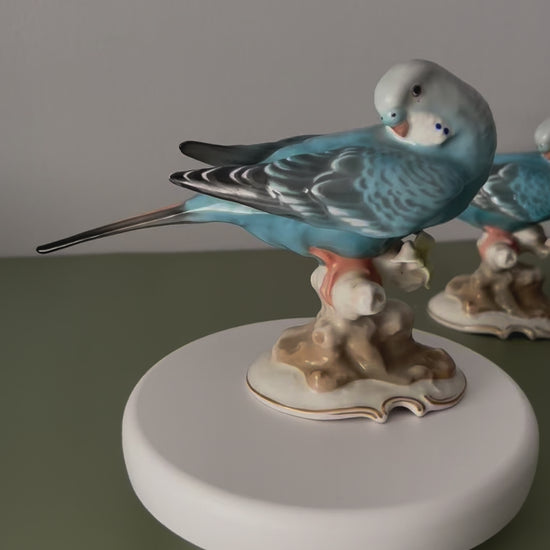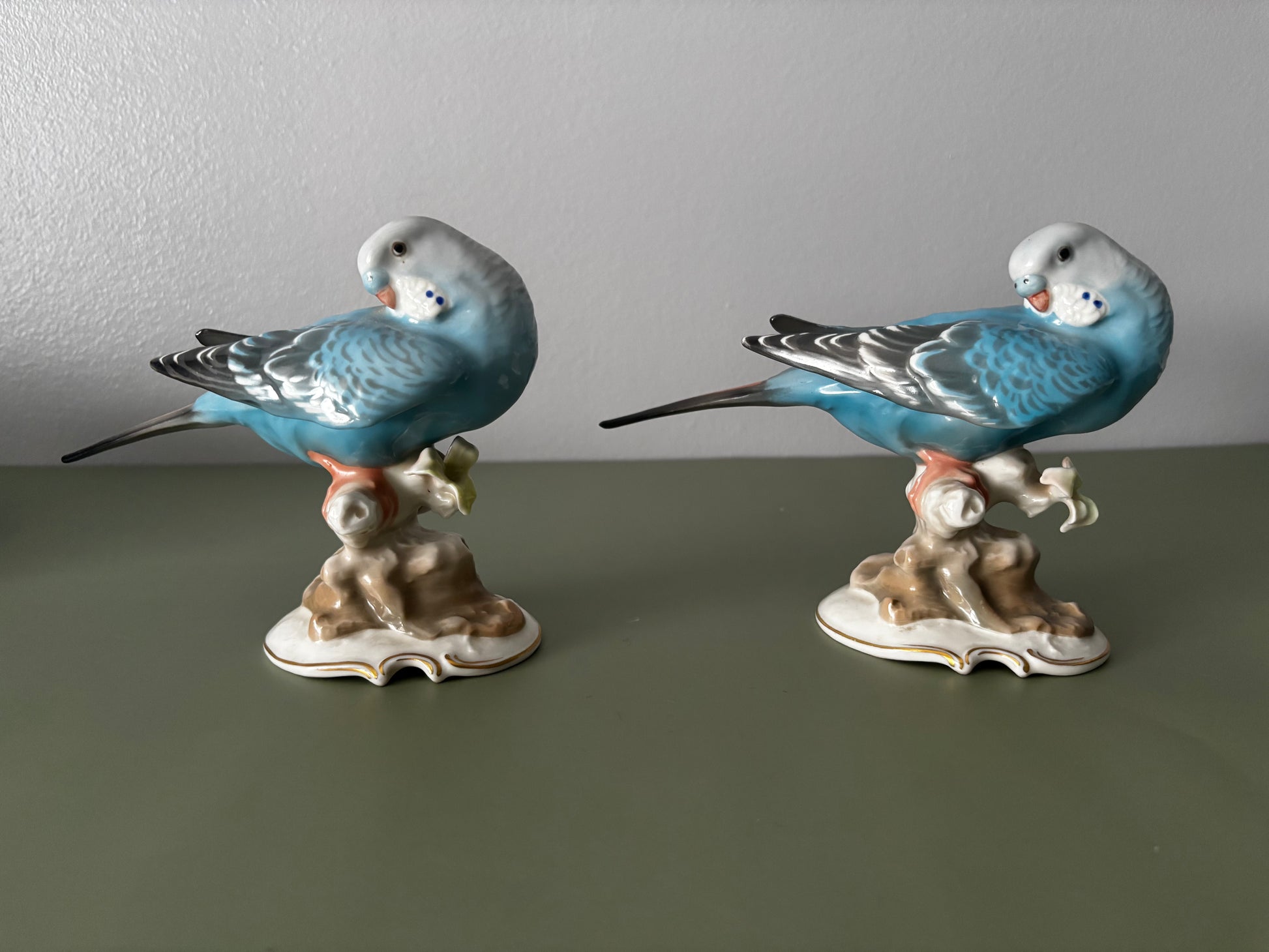 Jolie paire de perruches en porcelaine allemande signée K. TETTER LHS (Lions) de Kunstabteilung