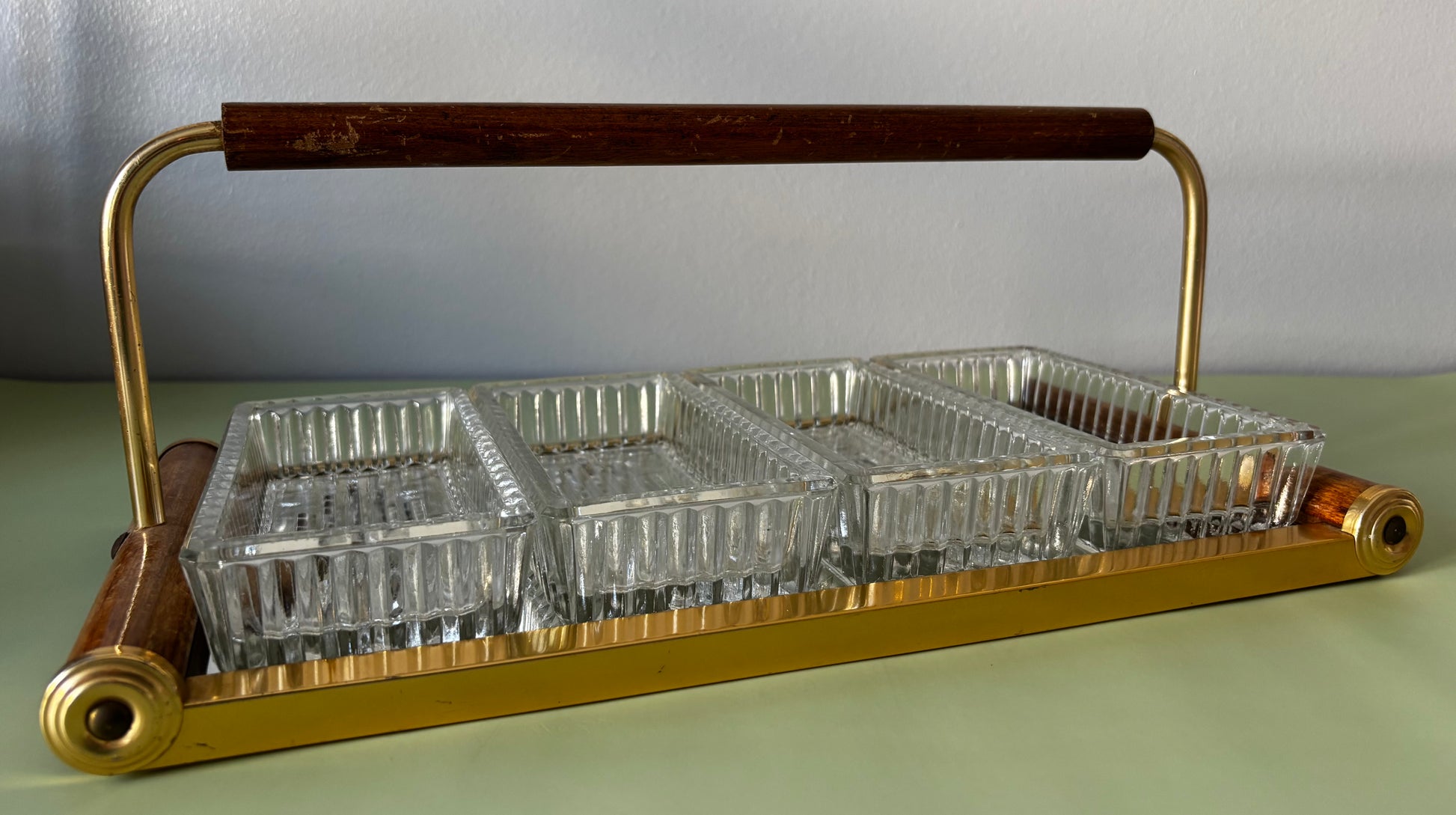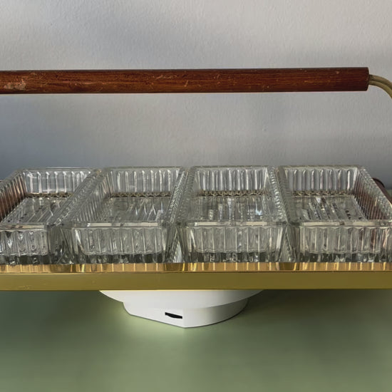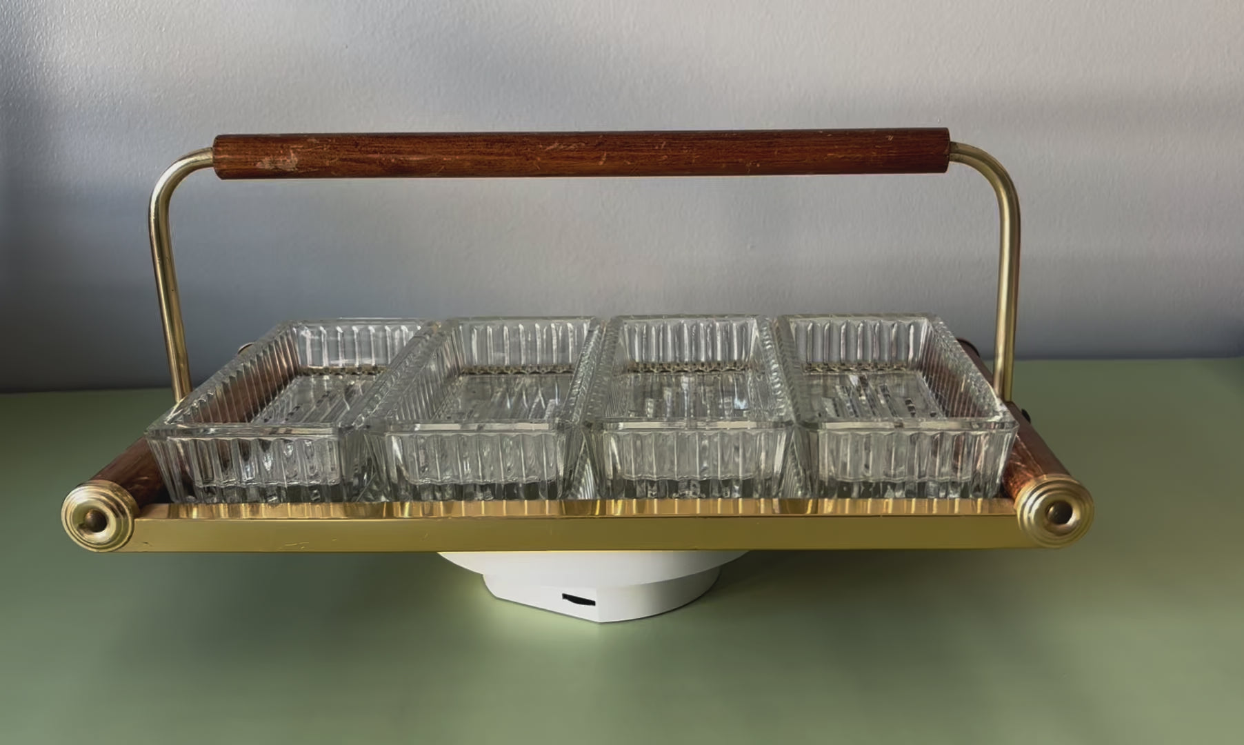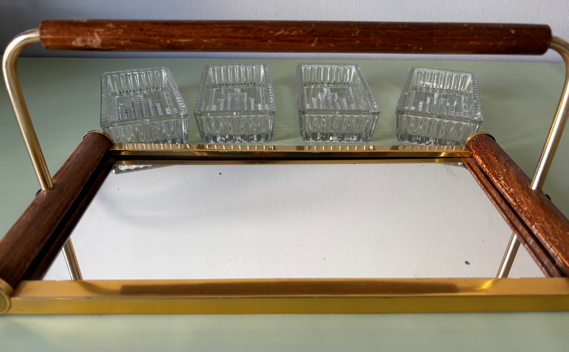 La structure est en bois et métal doré. Le plateau est composé d'un miroir sur lequel les 4 ramequins viennent prendre place