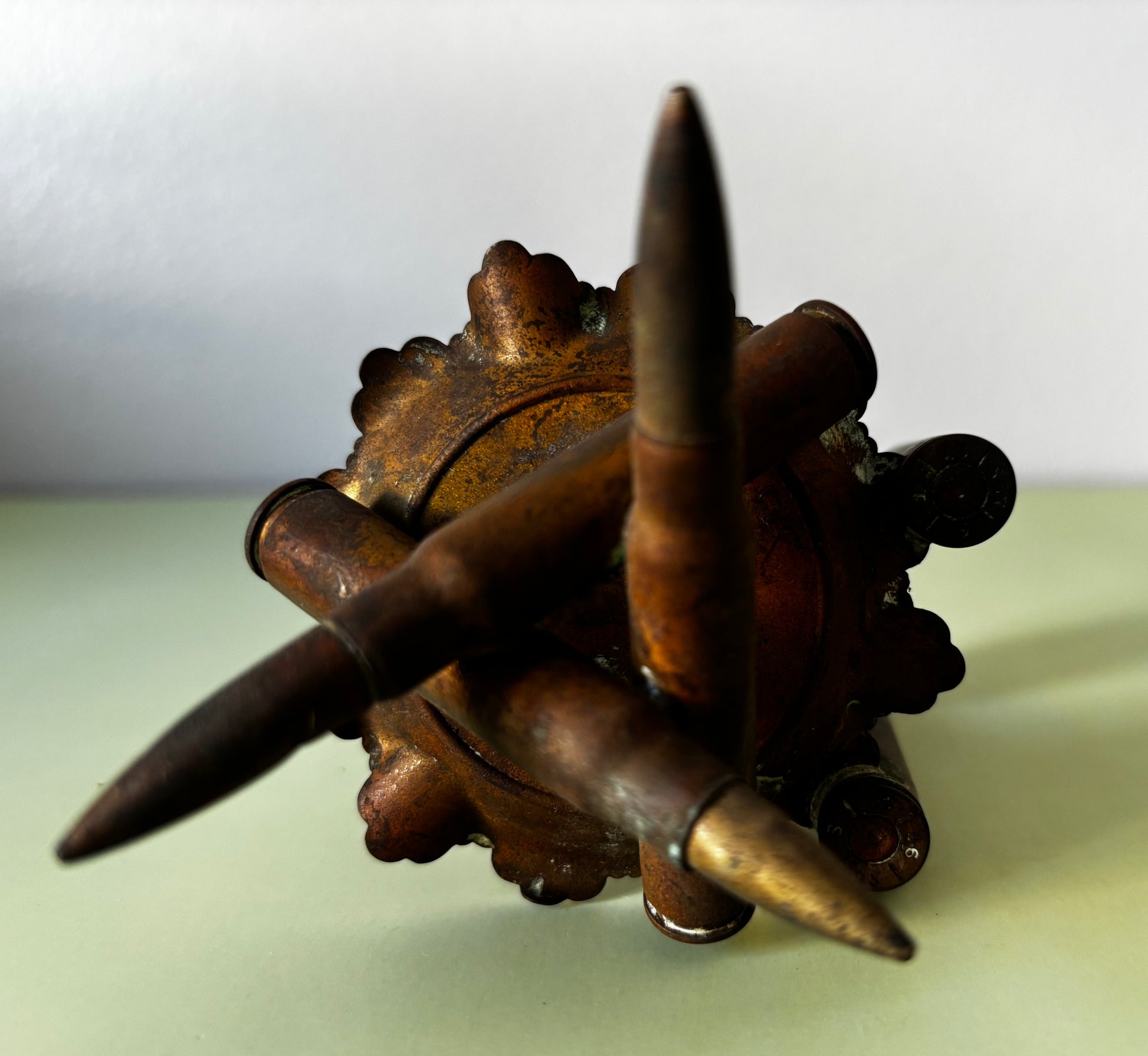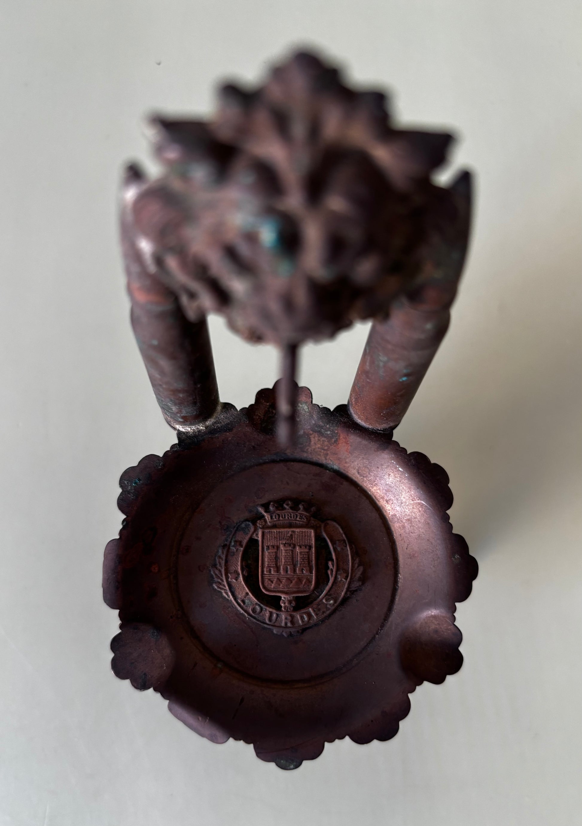 Artisanat de tranchées : support montre à gousset, tête de lion et blason Lourdes France