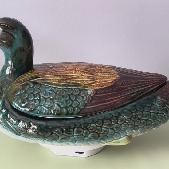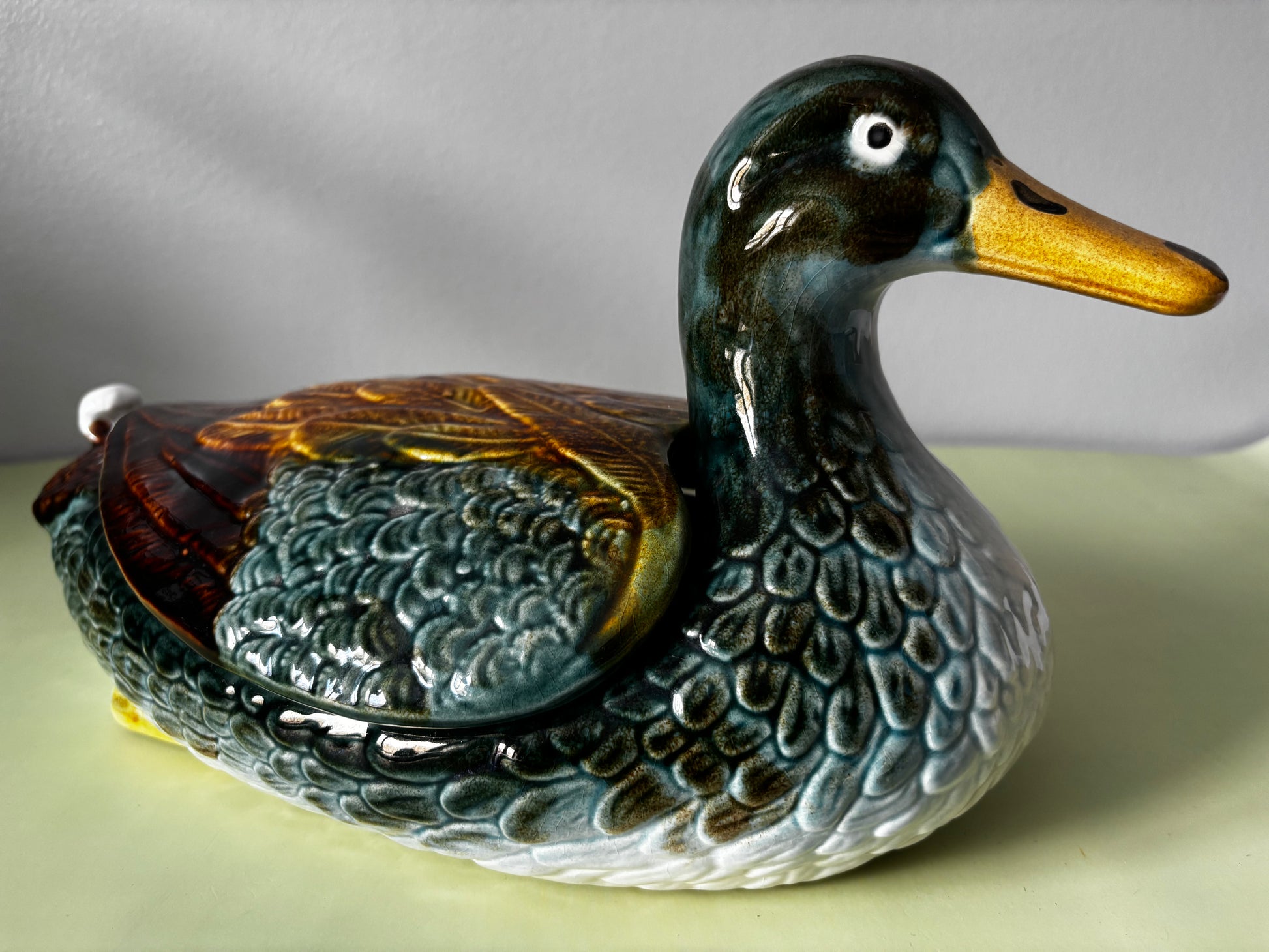 Soupière ou plat en forme de canard avec son couvercle en céramique émaillée polychrome