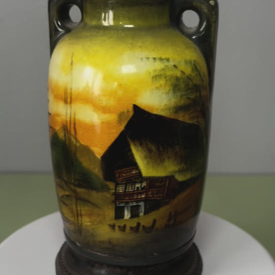Joli vase en céramique peint à la main, décor paysage de ferme.