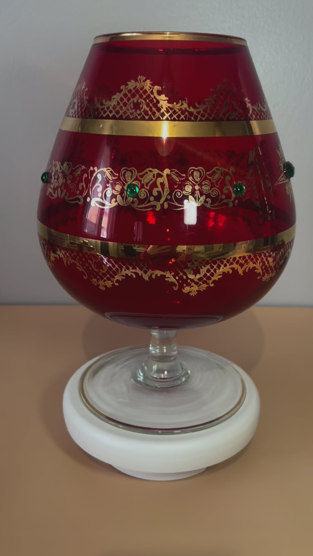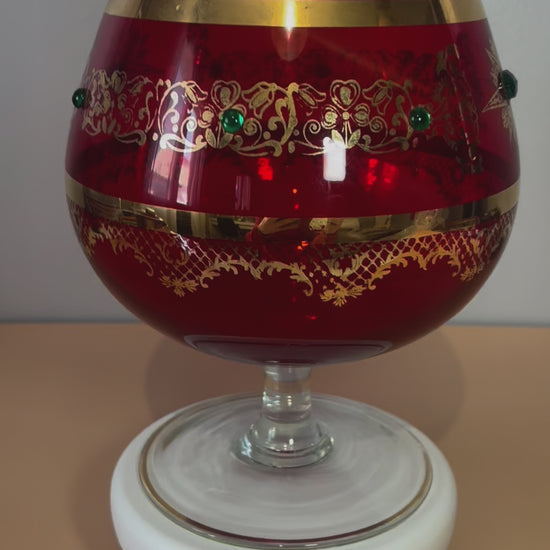 - Verre à pied soufflé de Murano de couleur rouge avec liserés et ornements dorés.